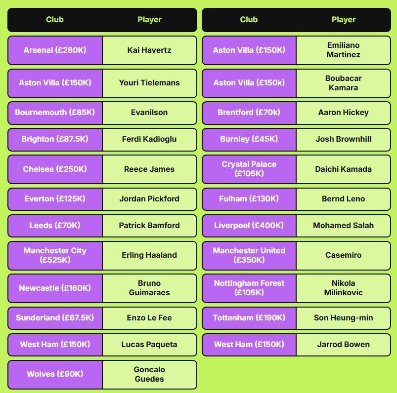 英超各队顶薪球员:哈兰德52.5万周薪霸榜,卡塞米罗、哈弗茨在列